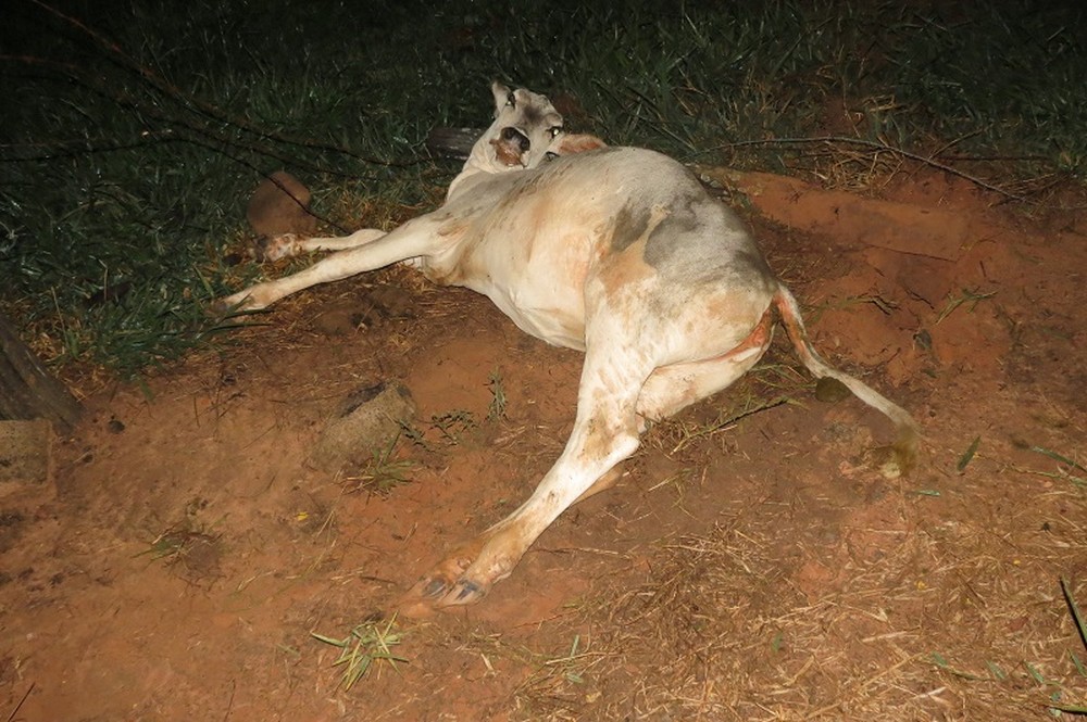 No local, os policiais constataram que um carro teria invadido a cerca de limitação com um pasto e atropelado um animal bovino. O condutor do veículo já não estava mais no lugar do acidente.