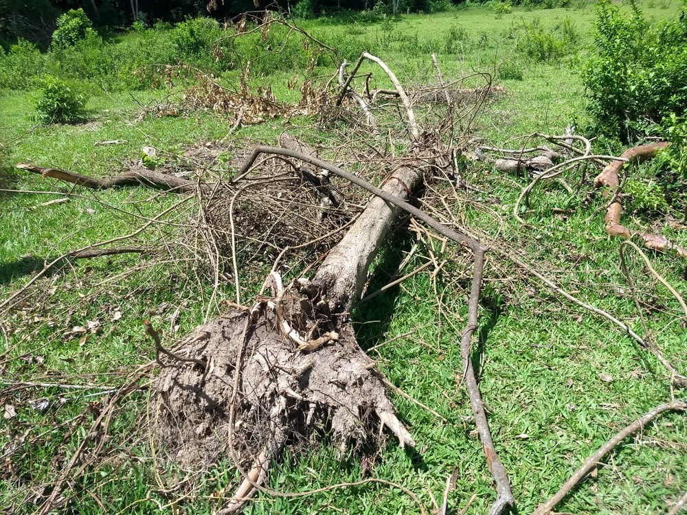 Os policiais receberam uma denúncia sobre o corte de árvores na propriedade rural e, ao chegar no local, constataram a derrubada de dez árvores, das espécies amendoim e leiteiro, em área comum.