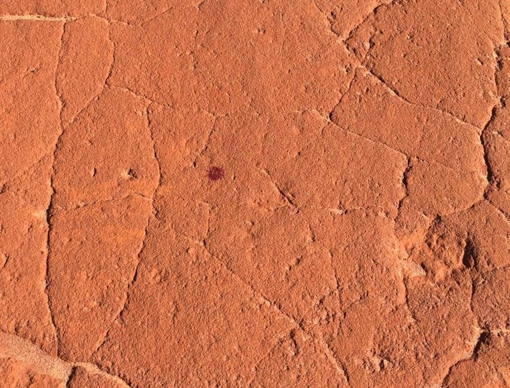 Embaixo desse ponto de ônibus, foram encontradas algumas gotas de sangue e, na outra margem da rodovia, a polícia encontrou pegadas compatíveis com o solado dos chinelos calçados pela vítima e também algumas gotas de sangue que, pelas suas disposições, demonstravam que a vítima correu no sentido rodovia-margem direita.