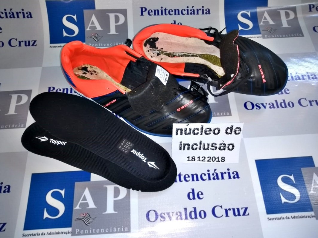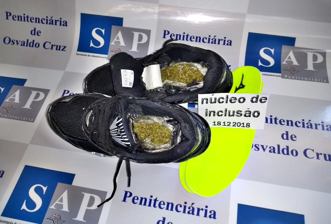 O Agente de Segurança Penitenciária do Núcleo de Inclusão, enquanto submetia a revista os produtos enviados via Sedex ao reeducando R.S.S., condenado a 8 anos, 3 meses e 16 dias de prisão pelo crime de roubo, encontrou, enrolada em plástico, certa quantidade de maconha, homiziada sob as duas palmilhas de um par de tênis da marca "MIZUNO".