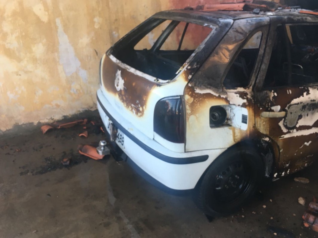 No local, os Bombeiros se depararam com o veÃculo em chamas, e parte da área externa e do telhado da residência também incendiados.