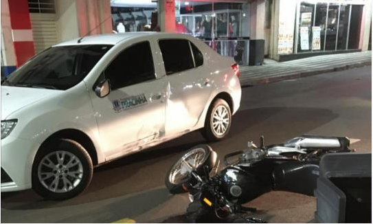 O veículo, um Renault Logan, fazia uma manobra para estacionar quando uma moto, que seguia na mesma direção, bateu na lateral do carro.