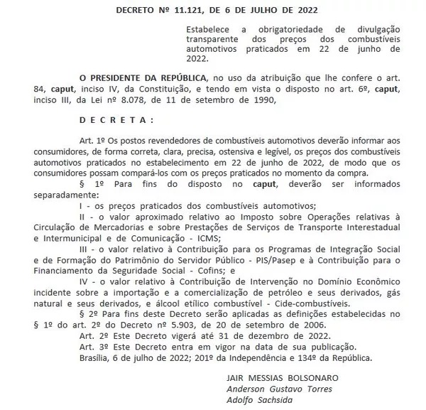 O decreto vale até o final de 2022, mas não prevê punição para o posto que não cumprir a determinação do governo. Segundo o próprio Planalto, a ANP e os órgãos de defesa do consumidor apenas "orientarão" os postos sobre a medida.