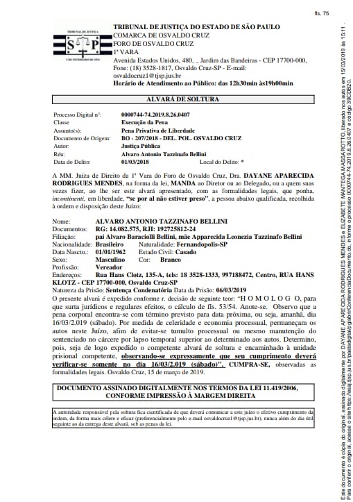 A Juíza da 1ª Vara da Comarca de Osvaldo Cruz, Dra. Dayane Aparecida Rodrigues Mendes, expediu na tarde da última sexta-feira (15), o Alvará de Soltura do vereador Álvaro Antônio Tazzinafo Bellini.