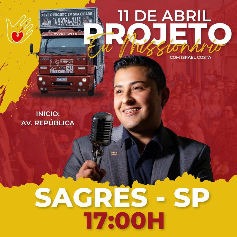 A partir das 17 horas, o Missionário Israel Costa, vai pregar na Avenida República e o evento é aberto a toda população.