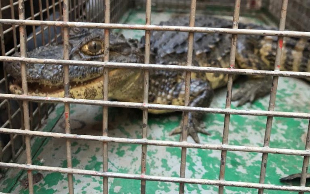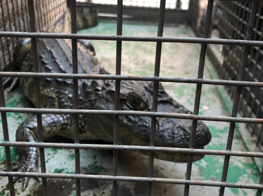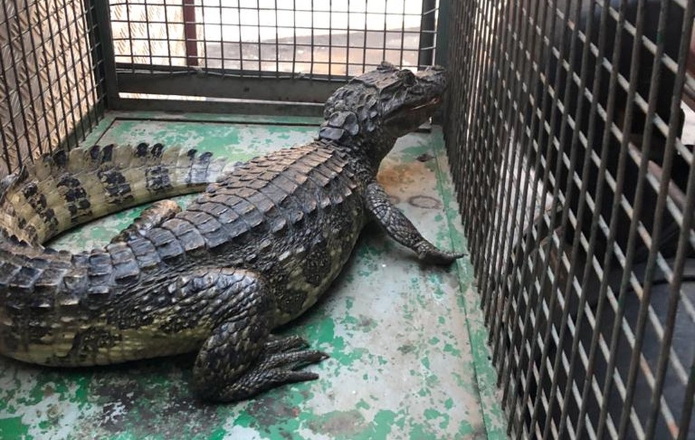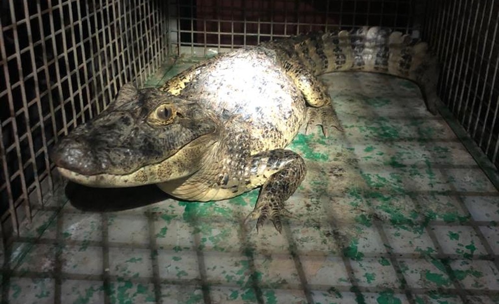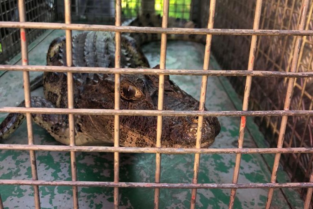 Com cerca de 1,5 metro de comprimento, o filhote de jacaré foi capturado no local e, posteriormente, solto em habitat natural no Rio do Peixe, em Dracena (SP).