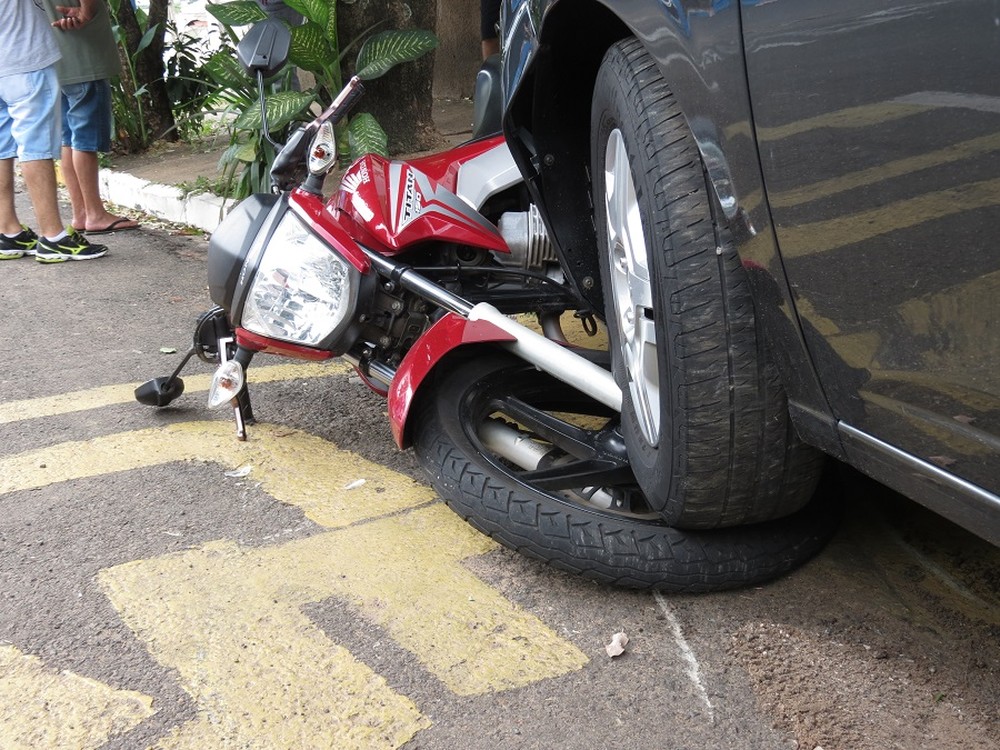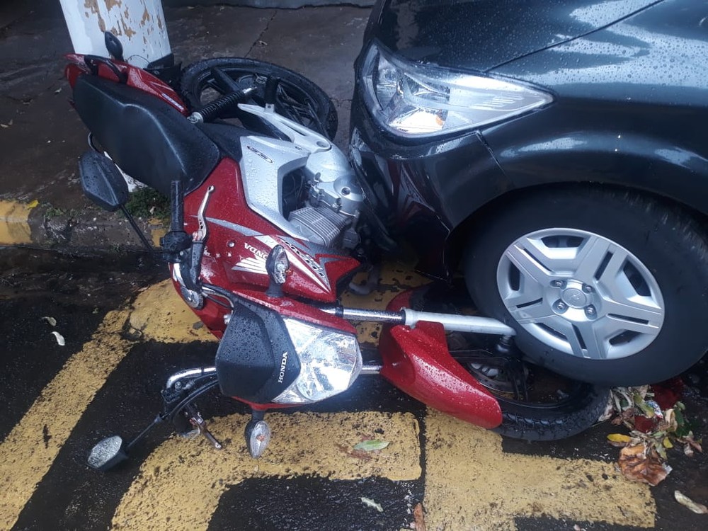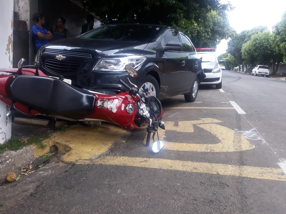 O automóvel, que estava estacionado, foi atingido por um caminhão e, em seguida, derrubou a moto, também parada, na Rua Magid Zacarias.