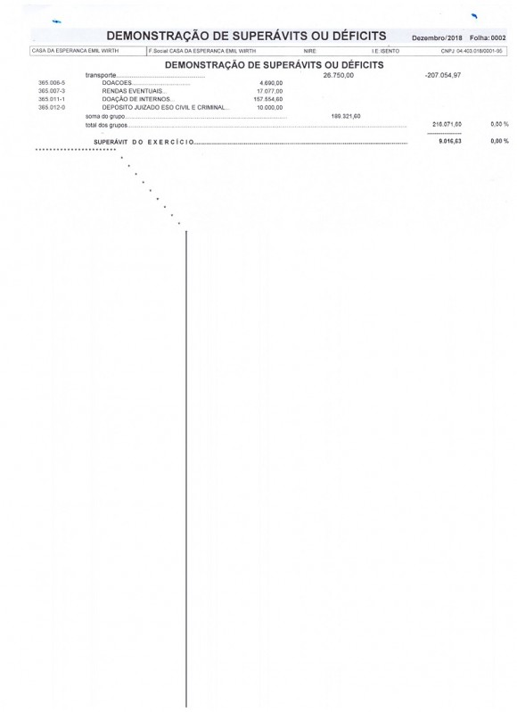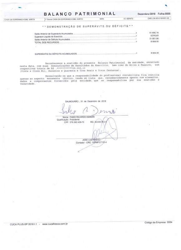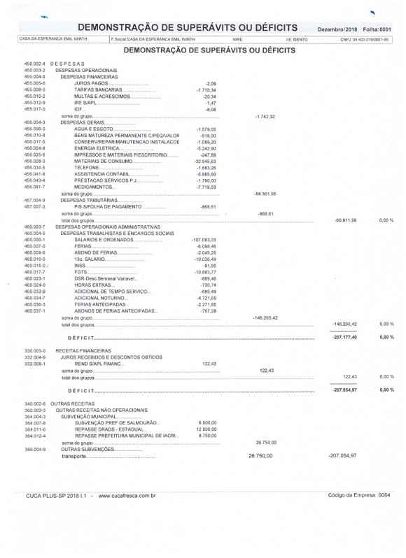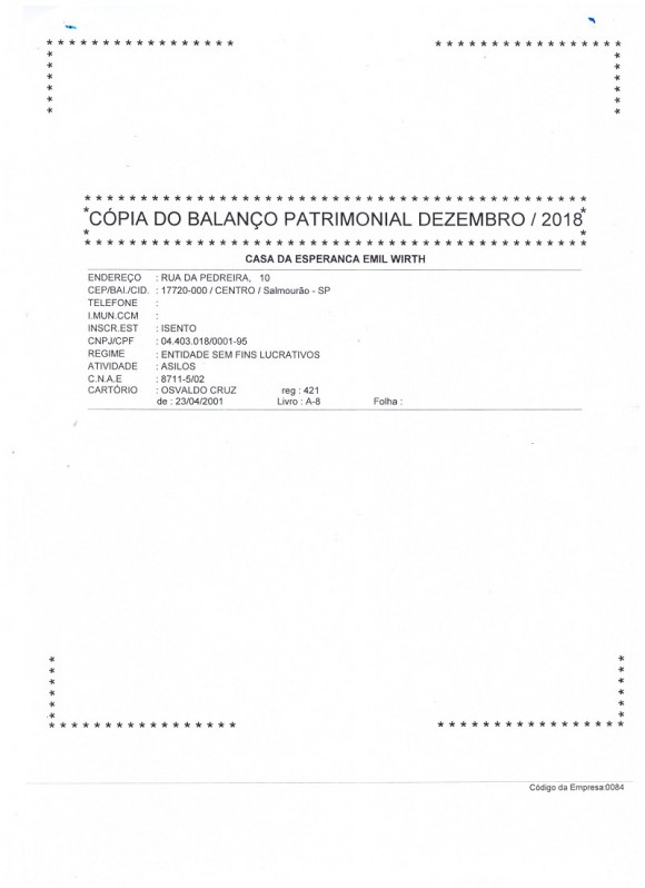A Casa da Esperança Emil Wirth de Salmourão, visando demonstrar transparência e seriedade sobre o exercício de suas atribuições filantrópicas, vem através de seu Presidente, o senhor Fábio Ricardo Demori e da Assistente Social da instituição, a senhora Celiane Sampaio, junto ao Portal de Notícias AtaNews, tornar público o conteúdo do balanço referente ao exercício contábil de 2018, juntamente com o relatório das atividades desenvolvidas pela instituição no decorrer do último ano.