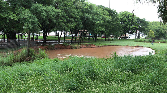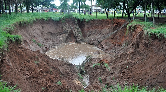 As chuvas dos últimos dias, sobretudo desta terça-feira (26) ampliaram os estragos no Parque dos Pioneiros, em Adamantina. Desde o início de 2013 o local vem sofrendo com problemas estruturais, diante da ruptura das galerias metálicas subterrâneas, e a cada nova chuva o cenário se agrava.