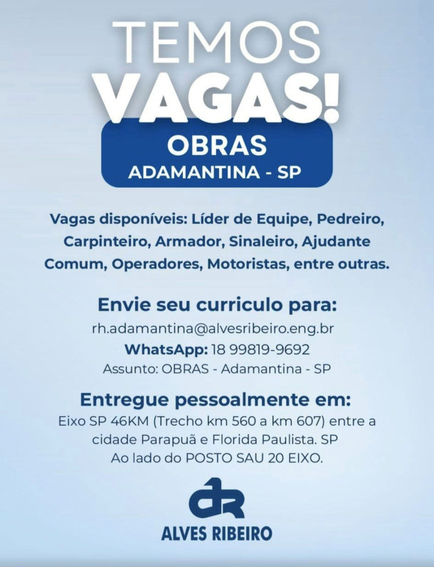 Os currículos podem ser enviados para o e-mail: rh.adamantina@alvesribeiro.eng.br