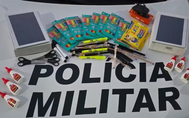 Entre os materiais furtados, a Polícia Militar recuperou mais de 20 itens, como tubos de cola, caixas de lápis de cor, tesouras, lápis, canetas e marcadores de texto, além de dois tablets.