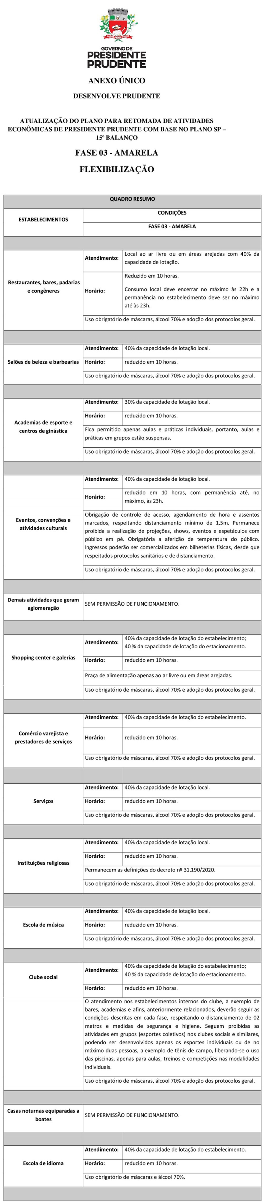 A Prefeitura de Presidente Prudente publicou nesta terça-feira (13), no "Diário Oficial Eletrônico", um decreto com a medida de quarentena e a atualização das condições permitidas para a fase amarela do Plano São Paulo. Com as mudanças, o horário máximo de funcionamento de diversos setores foi ampliado para 10 horas.