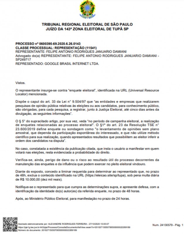 O Tribunal Regional Eleitoral de São Paulo - Juízo da 143ª Zona Eleitoral de Tupã, determinou por LIMINAR que seja excluída uma enquete eleitoral que circulava na internet.