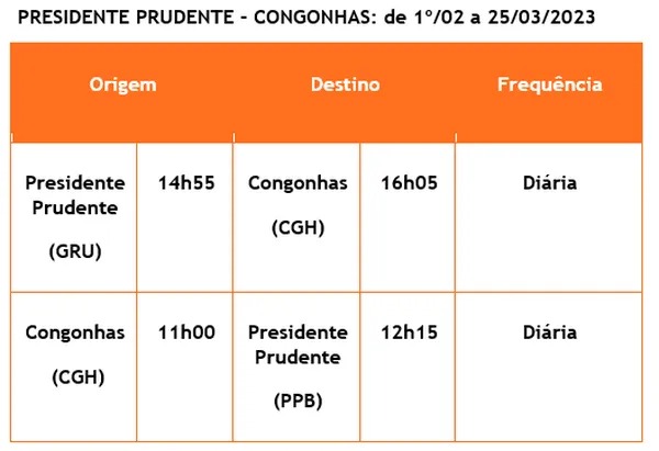A partir de 26 de março, os voos passarão a ter seis frequências de ida e volta por semana, de domingo a sexta-feira. Em Congonhas, a partida será às 12h25 e a chegada em Presidente Prudente está marcada para às 13h40. O retorno para a capital paulista está marcado para às 14h25, com pouso às 15h35.