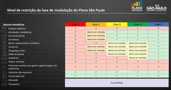 - Fase 5, azul: "Normal controlado" - todos os setores em funcionamento, mas mantendo medidas de distanciamento e higiene.