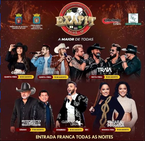 A Exapit 2024 começa nesta semana em Tupã, sendo realizada de 14 a 19 de agosto.O evento, que volta ao seu período tradicional em agosto, contará com entrada gratuita todas as noites e uma programação musical de destaque. Haverá o tradicional rodeio em touros e exposições agropecuárias.A abertura será na quarta-feira, 14 de agosto, com Ana Castela, a “Boiadeira”. Ana retorna a Tupã após se apresentar na cidade no início de sua carreira.Na quinta-feira, 15 de agosto, será a vez da dupla Bruno e Barretto, que vem ganhando espaço no cenário musical sertanejo.Na sexta-feira, 16 de agosto, o grupo Traia Véia se apresentará, seguido pela dupla Rio Negro e Solimões no sábado, 17 de agosto.O domingo, 18 de agosto, trará a apresentação de Gusttavo Lima, considerado uma das principais atrações da feira.A programação será encerrada na segunda-feira, 19 de agosto, com o show da dupla Maiara e Maraisa.