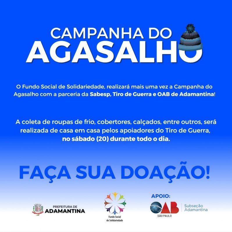 A Prefeitura de Adamantina, por meio do Fundo Social de Solidariedade, realizará mais uma vez a Campanha do Agasalho com a parceria da Sabesp e Tiro de Guerra de Adamantina.