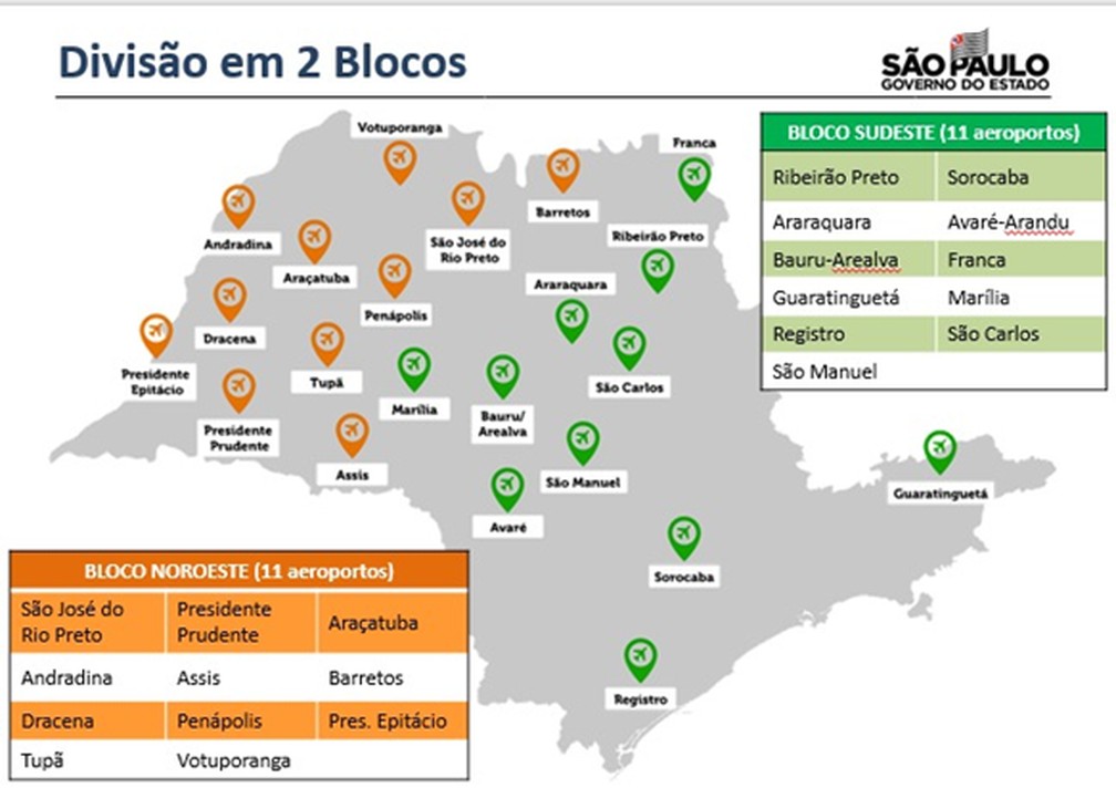 Os aeroportos estão divididos em dois blocos, noroeste e sudeste, e a concessão terá prazo de 30 anos. A documentação completa da concessão está disponível no site da Agência Reguladora de Serviços Públicos Delegados de Transporte do Estado de São Paulo (Artesp) e o edital está publicado no Diário Oficial do Estado (DOE) desta quinta-feira (15).