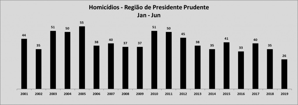 Os homicídios caíram 25,7% nos seis meses deste ano. A quantidade de ocorrências passou de 35 para 26 (9 a menos). É o menor número para o período da série histórica, iniciada em 2001. As vítimas de homicídio tiveram redução de 27,8% no semestre, com 10 casos a menos. A quantidade caiu de 36 para 26. É o menor número da série histórica.