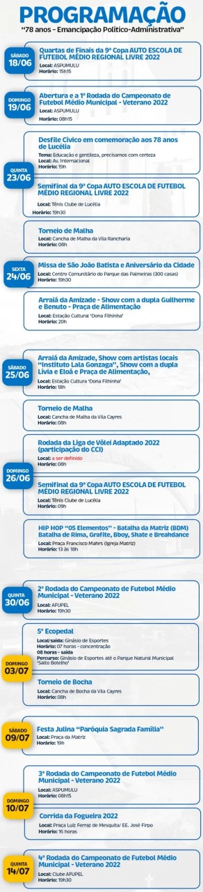 Foi divulgada pela Prefeitura de Lucélia a programação oficial do aniversário de 78 anos do município, celebrados em 24 de junho. A programação foi iniciada no último sábado (18), com as quartas de finais da 9ª Copa Auto Escola de Futebol Médio Regional Livre 2022, e segue até o dia 14 de julho, com atividades esportivas, religiosas, musicais e comunitárias.