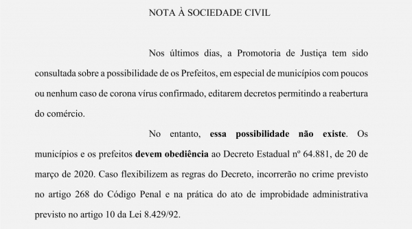 Segundo o promotor Cosme, "os municípios e os prefeitos devem obediência ao Decreto Estadual nº 64.881, de 20 de março de 2020. Caso flexibilizem as regras do Decreto, incorrerão no crime previsto no artigo 268 do Código Penal e na prática do ato de improbidade administrativa previsto no artigo 10 da Lei 8.429/92", reforça.