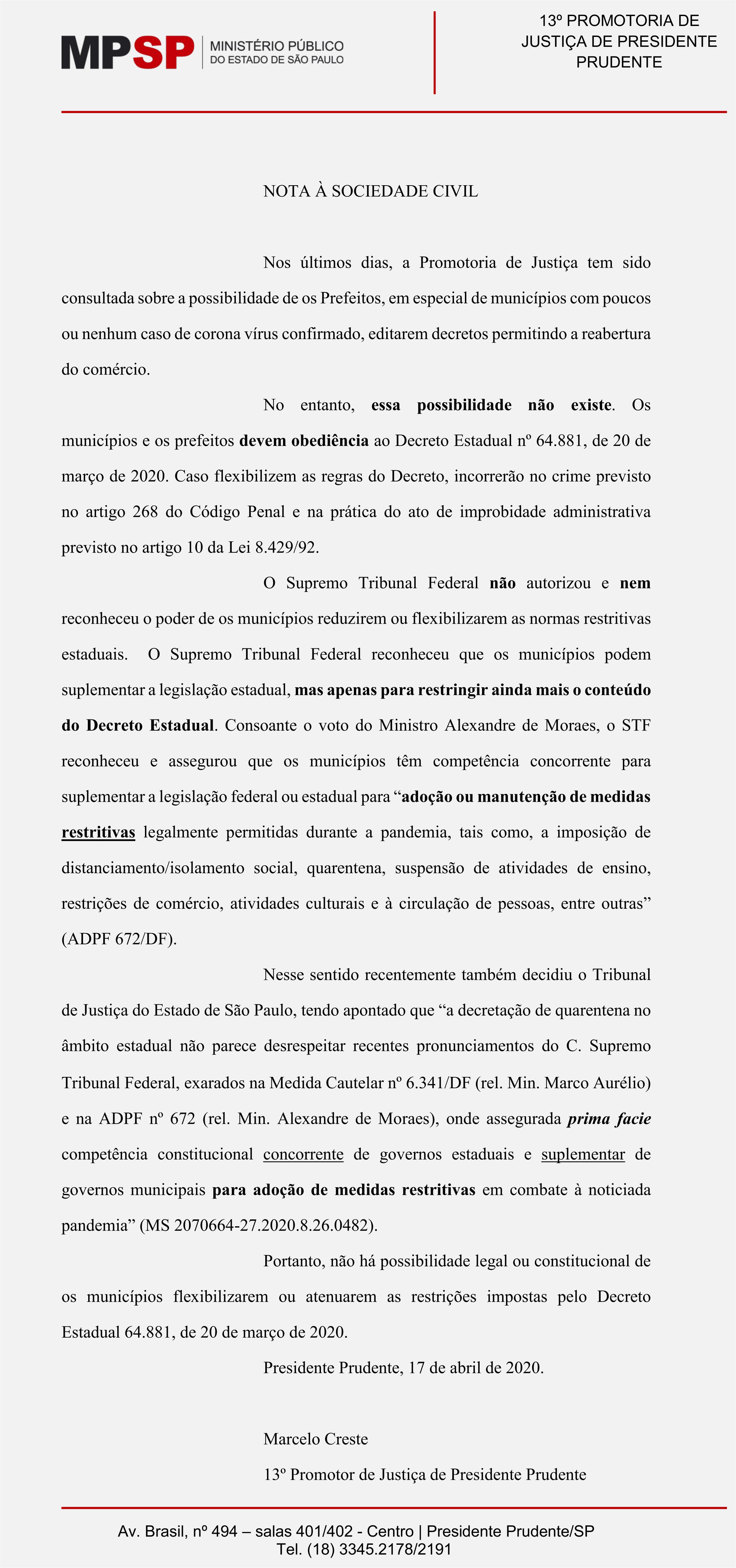 Uma nota de esclarecimento emitida pelo promotor de Justiça, Marcelo Creste, da 13ª Promotoria de Justiça de Presidente Prudente, alerta prefeitos em geral que tentarem editar decretos para reabertura do comércio ou que sejam conflitantes com o Decretao Estadual determinado pelo Governador João Dória, poderão ser processados por improbidade administrativa.