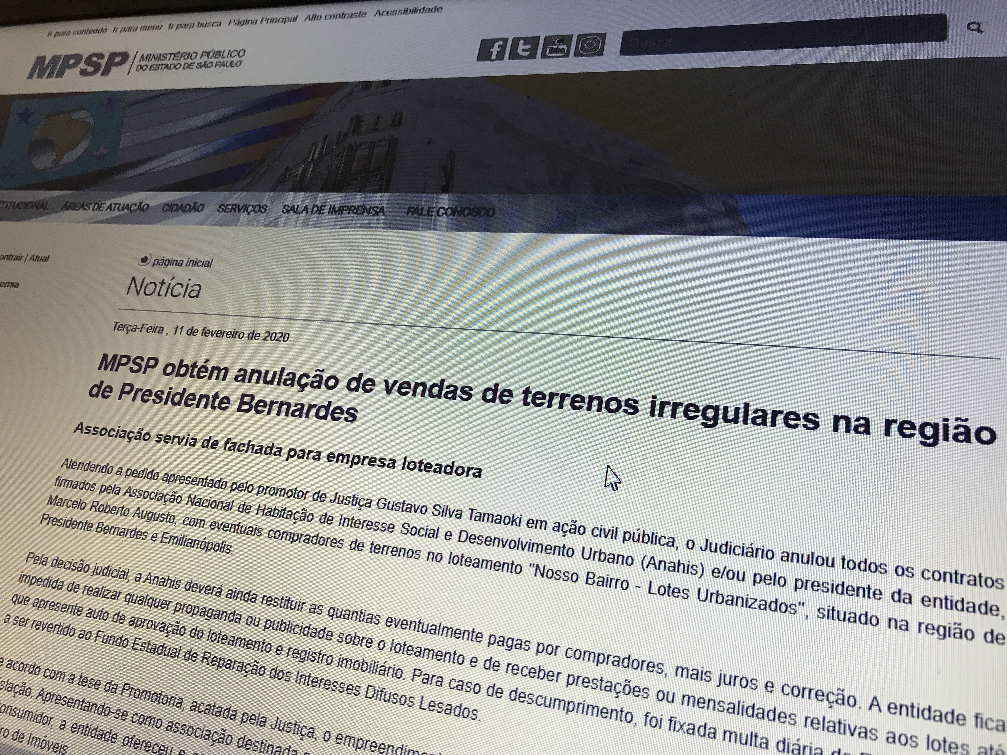 Atendendo a pedido apresentado pelo promotor de justiça Gustavo Silva Tamaoki em ação civil pública, o Poder Judiciário anulou todos os contratos firmados pela Associação Nacional de Habitação de Interesse Social e Desenvolvimento Urbano (Anahis) e/ou pelo presidente da entidade, Marcelo Roberto Augusto, com eventuais compradores de terrenos no loteamento "Nosso Bairro - Lotes Urbanizados", situado na região de Presidente Bernardes e Emilianópolis.