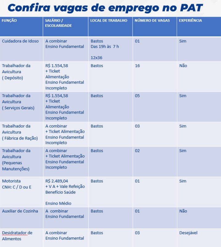 As pessoas que buscam emprego encontram 47 oportunidades no Posto de Atendimento ao Trabalhador (PAT) de Bastos. Das vagas que estão disponíveis para a cidade de Bastos, 16 para trabalho da avicultura (depósito), uma de auxiliar de cozinha, uma para auxiliar de manutenção de máquinas de refrigeração, cinco de auxiliar de produção e cinco para auxiliar de campo não exigem experiência do candidato.
