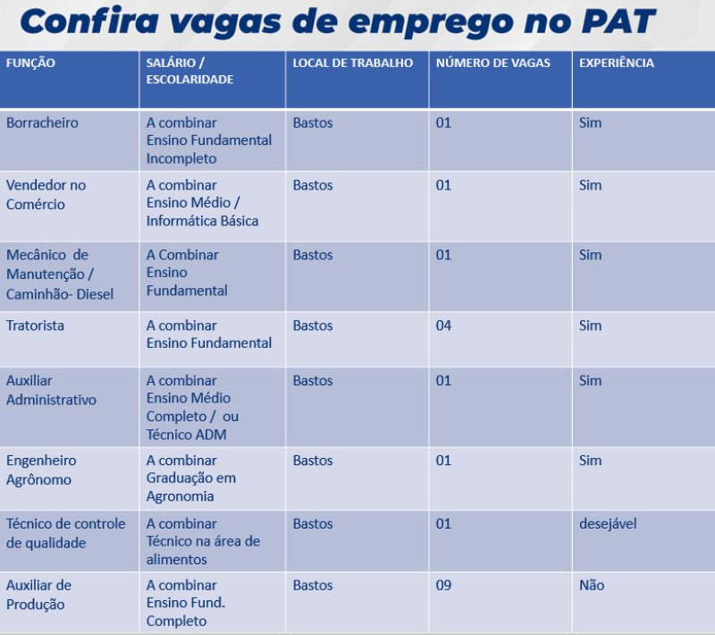 Nesta segunda-feira, dia 9, as pessoas que buscam emprego encontram 38 oportunidades no Posto de Atendimento ao Trabalhador (PAT) de Bastos. Das vagas que estão disponíveis, para Bastos e Iacri, nove de auxiliar de produção e não exigem experiência do candidato (veja detalhes abaixo).