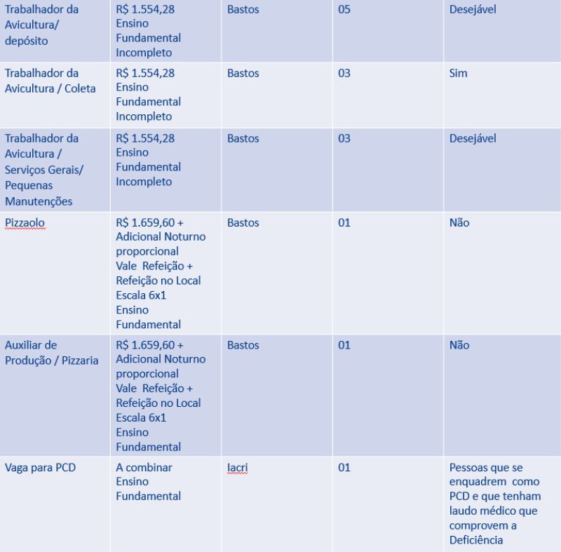 As pessoas que buscam emprego encontram 29 oportunidades no Posto de Atendimento ao Trabalhador (PAT) de Bastos. Das vagas que estão disponíveis, para Bastos e Iacri, seis de auxiliar de linha de produção, uma para auxiliar de produção / pizzaria e uma de pizzaolo não exigem experiência do candidato (veja detalhes abaixo).