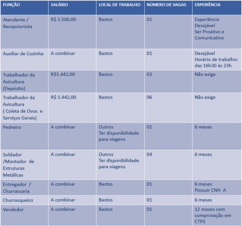 Na segunda-feira, dia 22, as pessoas que buscam emprego encontram 19 oportunidades no Posto de Atendimento ao Trabalhador (PAT) de Bastos. Das vagas que estão disponíveis, nove são para trabalho na avicultura, no setor de depósito, coleta de ovos e serviços gerais e não exigem experiência do candidato (veja detalhes abaixo).