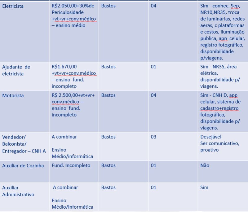 Na próxima segunda-feira, dia 19, as pessoas que buscam emprego encontram 55 oportunidades no Posto de Atendimento ao Trabalhador (PAT) de Bastos. Das vagas que estão disponíveis, uma é para auxiliar de cozinha e 10 para aprendiz e não exigem experiência do candidato (veja detalhes abaixo).