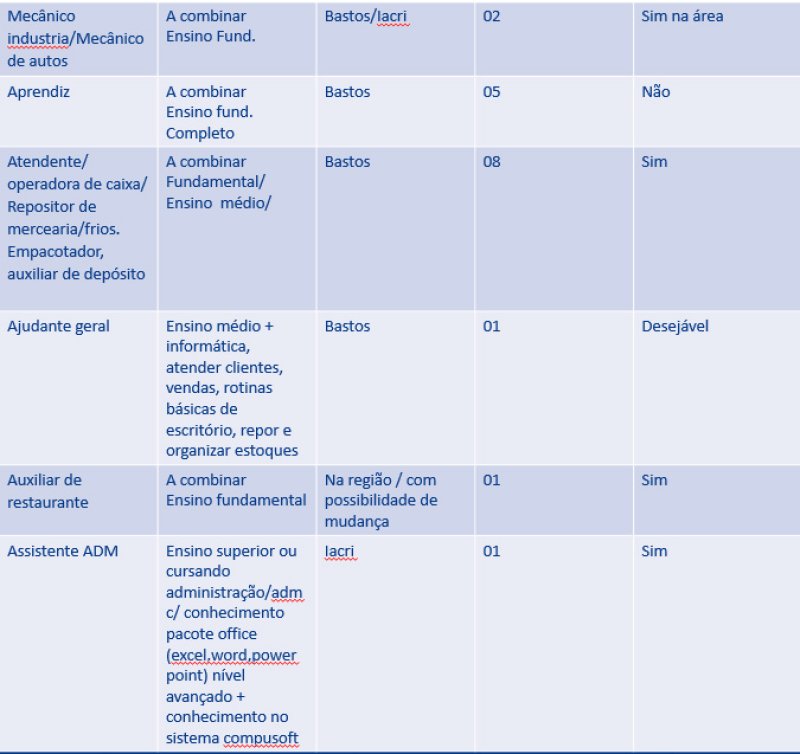 Na segunda-feira, dia 24, as pessoas que buscam emprego encontram 56 oportunidades no Posto de Atendimento ao Trabalhador (PAT) de Bastos. Das vagas que estão disponíveis 17 de auxiliar de produção e cinco de aprendiz não exigem experiência do candidato (veja detalhes abaixo).