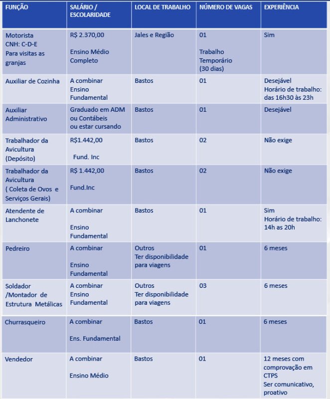 Na segunda-feira, dia 29, as pessoas que buscam emprego encontram 14 oportunidades no Posto de Atendimento ao Trabalhador (PAT) de Bastos. Das vagas que estão disponíveis, quatro são para trabalho na avicultura, no setor de depósito, coleta de ovos e serviços gerais e não exigem experiência do candidato (veja detalhes abaixo).
