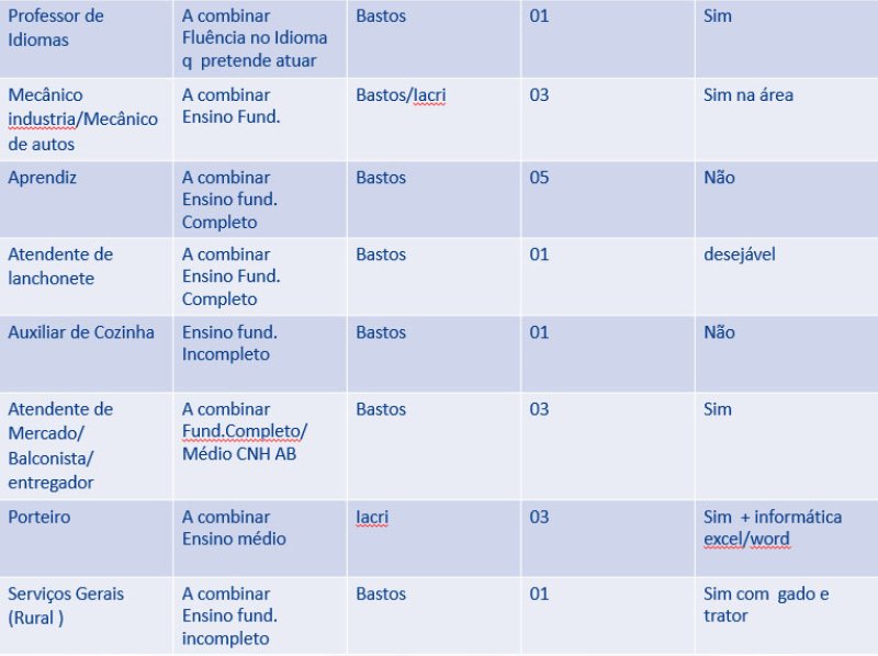 Maiores informações podem ser obtidas no Posto de Atendimento ao Trabalhador de Bastos, que atende na sala 4 do Poupatempo de Bastos, na Rua Campos Sales, 178, centro, ou pelos telefones (14) 99610-9766 e (14) 99745-3532, ou pelos telefones (14) 99610-9766 e (14) 99745-3532. O interessado deve procurar à unidade de emprego munido de RG, CPF, Carteira de Trabalho e currículo atualizado.