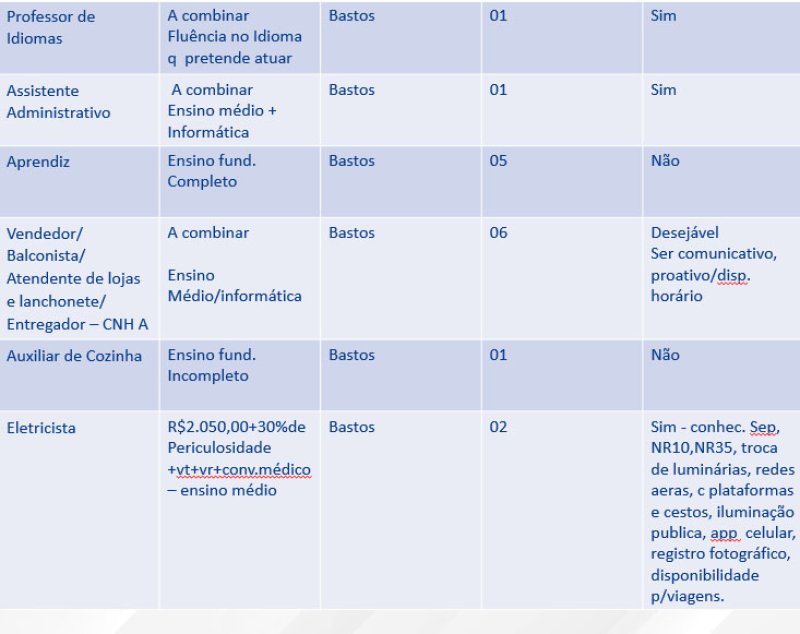 Maiores informações podem ser obtidas no Posto de Atendimento ao Trabalhador de Bastos, que atende na sala 4 do Poupatempo de Bastos, na Rua Campos Sales, 178, centro, ou pelos telefones (14) 99610-9766 e (14) 99745-3532, ou pelos telefones (14) 99610-9766 e (14) 99745-3532. O interessado deve procurar à unidade de emprego munido de RG, CPF, Carteira de Trabalho e currículo atualizado.