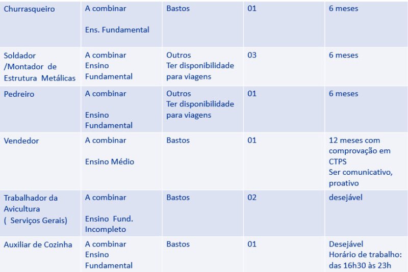 Na segunda-feira, dia 5, as pessoas que buscam emprego encontram 38 oportunidades no Posto de Atendimento ao Trabalhador (PAT) de Bastos. Das vagas que estão disponíveis, duas são para trabalho na avicultura, no setor de depósito e 20 para aprendiz e não exigem experiência do candidato (veja detalhes abaixo).