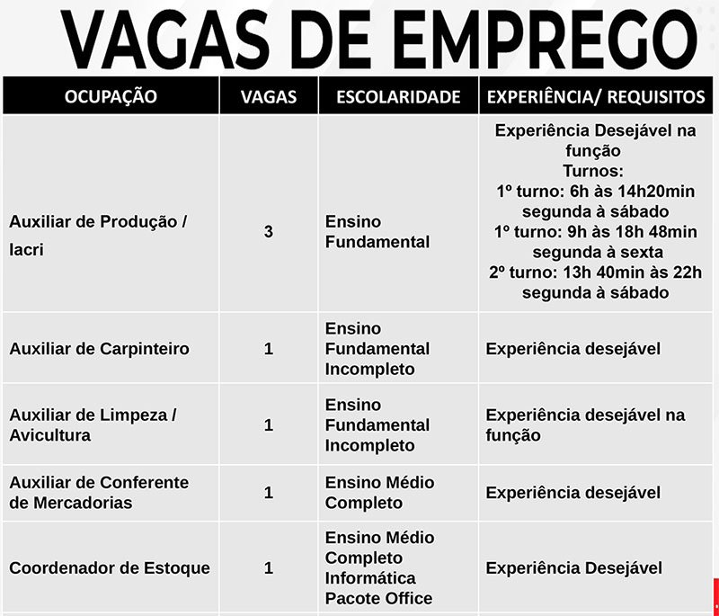 Das vagas disponíveis, 1 de desidratador de alimentos, 1 de trabalhador da avicultura (fábrica de ração), 10 de trabalhador da avicultura (depósito), 2 de trabalhador da avicultura (vacina) e 3 de trabalhador da avicultura (serviços gerais), não exigem experiência do candidato.