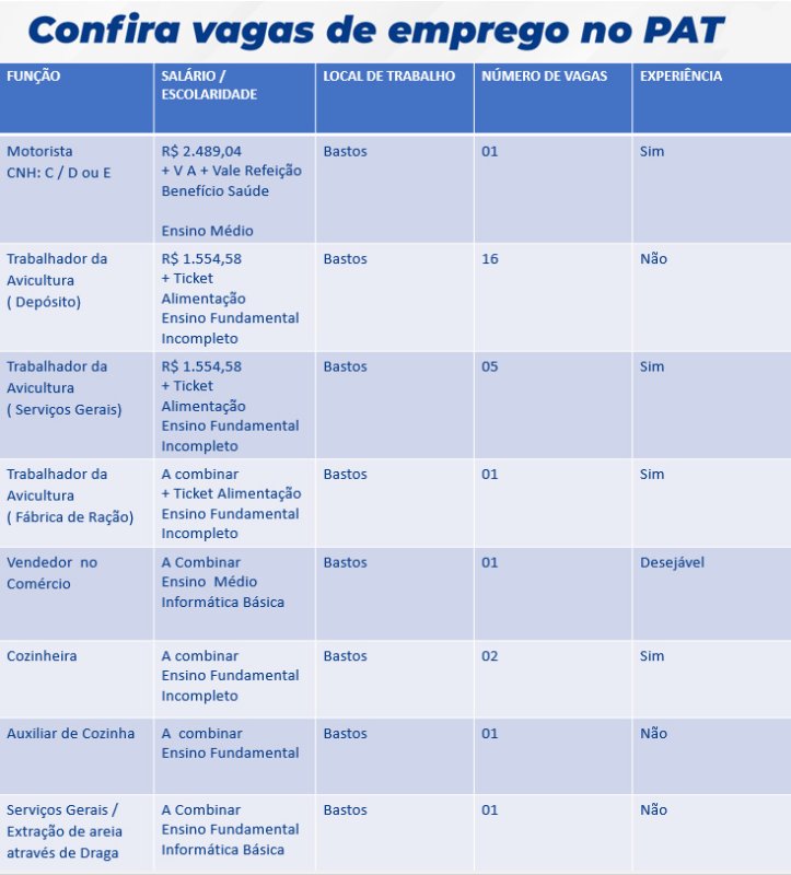 As pessoas que buscam emprego encontram 41 oportunidades no Posto de Atendimento ao Trabalhador (PAT) de Bastos. Das vagas que estão disponíveis para a cidade de Bastos, uma para serviços gerais (extração de areia através de draga), 16 de trabalhador da avicultura (depósito), cinco de auxiliar de produção, uma de auxiliar de cozinha, quatro de auxiliar de campo e uma de auxiliar de manutenção de máquinas de refrigeração não exigem experiência do candidato.