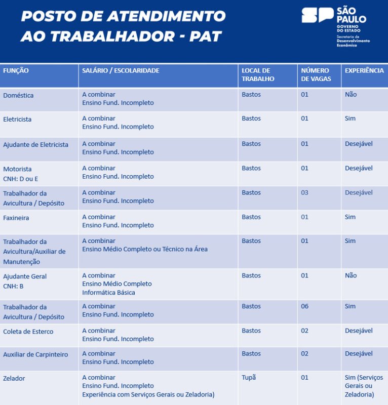 Maiores informações podem ser obtidas no Posto de Atendimento ao Trabalhador de Bastos, que atende na sala 4 do Poupatempo de Bastos, na Rua Campos Sales, 178, centro, ou pelos telefones (14) 99610-9766 e (14) 99745-3532. O interessado deve procurar à unidade de emprego munido de RG, CPF, Carteira de Trabalho e currículo atualizado.