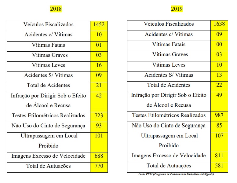 Na "Operação República 2019" foram fiscalizados 1638 veículos, registrados 09 acidentes com Vítimas, 03 Vítimas Graves, 10 Vítimas Leves, 13 Acidentes sem Vítimas. Felizmente não foram registradas vítimas fatais.