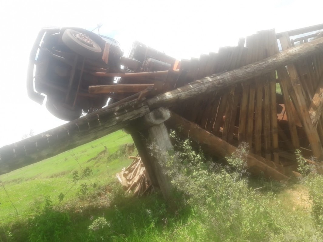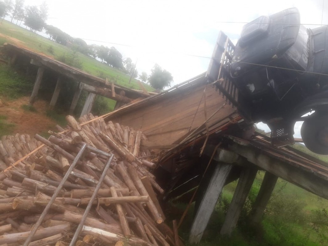 Uma ponte de madeira na zona rural de Mirante do Paranapanema cedeu quando um caminhão que transportava uma carga de eucalipto passava pelo local, na noite desta segunda-feira (10).