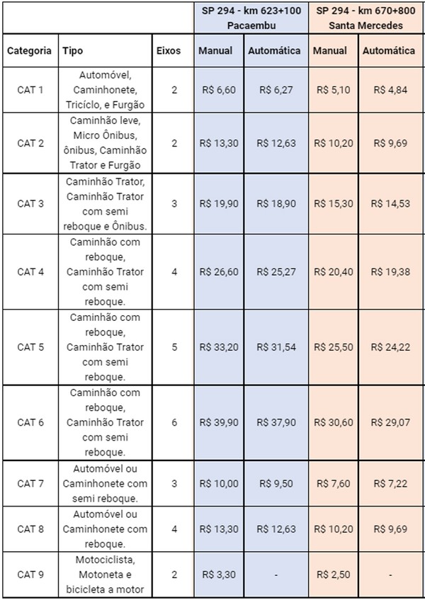 A partir da 0h desta quinta-feira (12), tem início a operação das duas novas praças de pedágios, na Rodovia Comandante João Ribeiro de Barros (SP-294), em Santa Mercedes (SP) e em Pacaembu (SP).