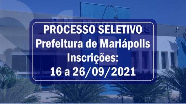 A Prefeitura de Mariápolis está com inscrições abertas em processo seletivo com oportunidades em diversos cargos na estrutura da administração pública municipal, para contratação por tempo determinado. Segundo o Edital de Processo Seletivo Nº 01/2021, as inscrições foram iniciadas na sexta-feira (16) e seguem até o dia 26 deste mês, e devem ser feitas exclusivamente no site www.consesp.com.br.