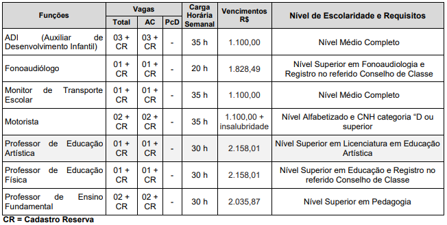 As vagas são para as funções de auxiliar de desenvolvimento infantil (ADI), fonoaudiólogo, monitor de transporte escolar, motorista, professor de educação artística, professor de educação física e professor de ensino fundamental. A remuneração mensal varia de R$ 1.100,00 a R$ 2.158,01 mensais.