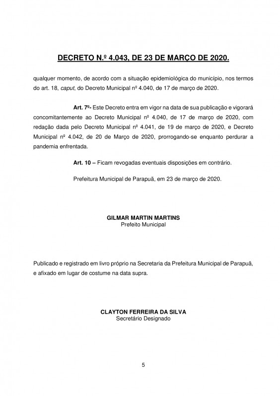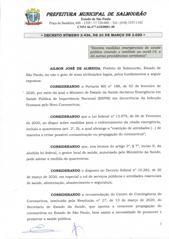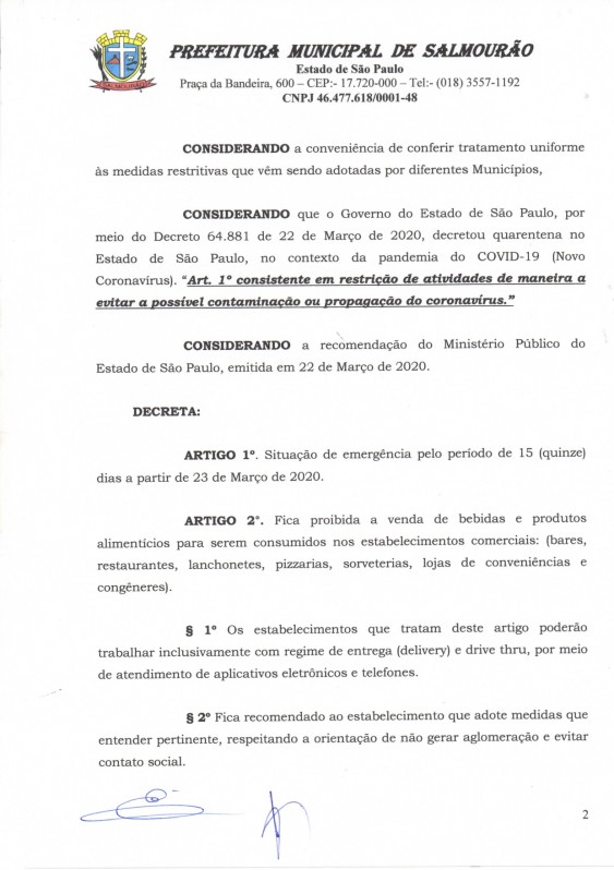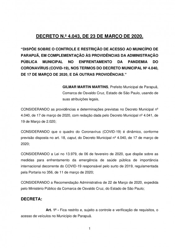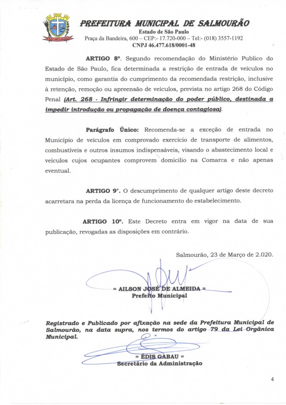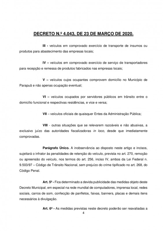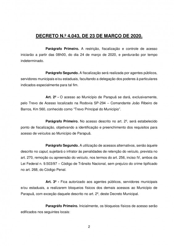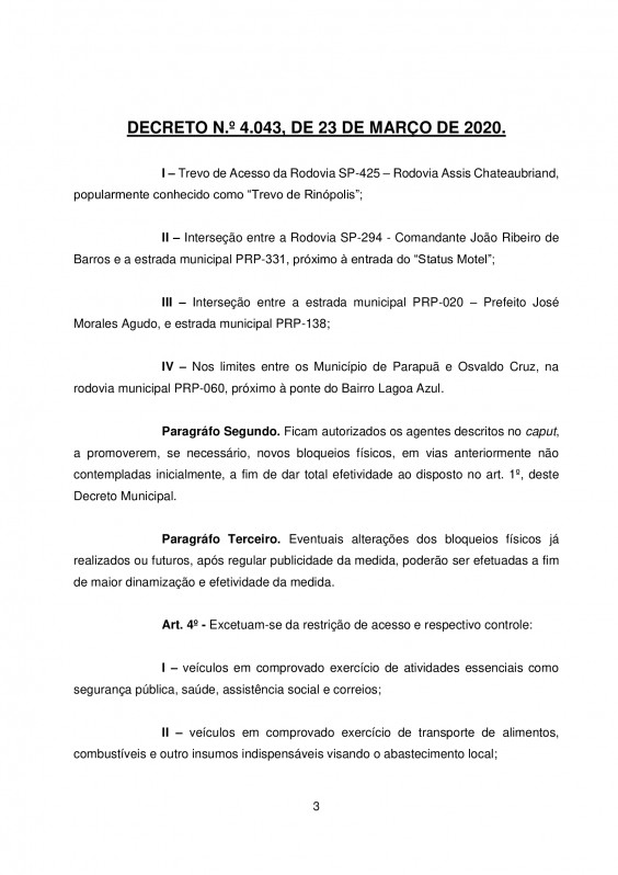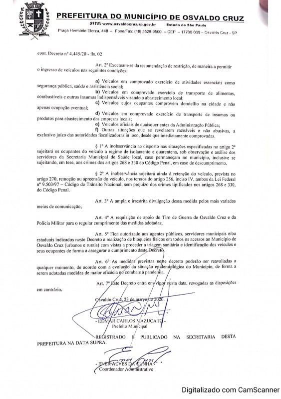 O Decreto de Osvaldo Cruz foi divulgado no final da tarde desta segunda-feira (23) e com isso, poderão ser adotadas medidas de retenção, remoção ou apreensão de veículos para os casos de flagrante delito pela prática do crime previsto no artigo 268 do Código Penal ou de infrações à legislação de trânsito.