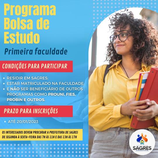 A Prefeitura de Sagres está com inscrições abertas do Programa "Bolsa de Estudo". Os estudantes devem procurar a Prefeitura até o dia 20 de janeiro.
