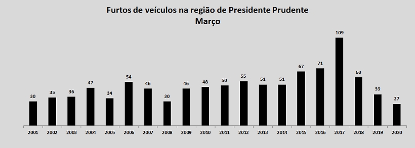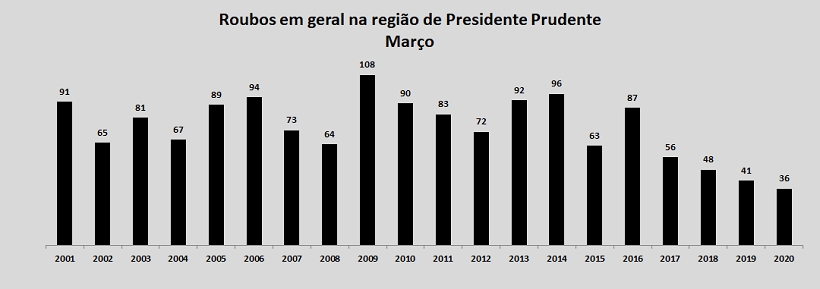 A região de Presidente Prudente terminou o mês de março com redução nas ocorrências de roubos e furtos em geral e nos furtos de veículos. Os casos e vítimas de homicídios ficaram estáveis, enquanto os roubos a banco e extorsões mediante sequestro permaneceram zerados.