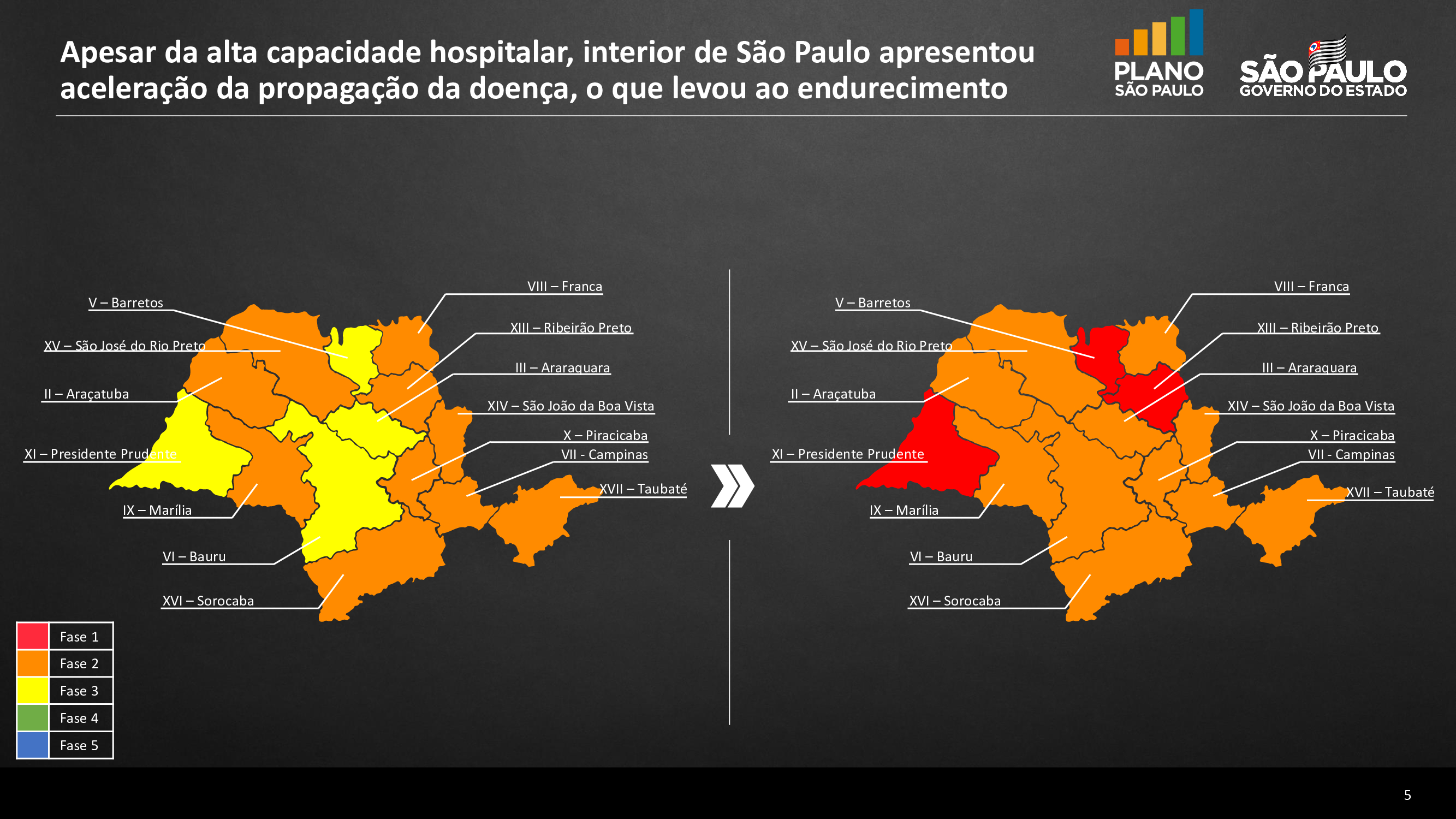 "Com o Plano São Paulo que já anunciamos, podemos atuar melhor em cada região do Estado e, claramente, temos um aumento de casos em regiões como Barretos, Presidente Prudente e Ribeirão Preto, que estão neste momento com a bandeira vermelha e que terão, agora, medidas restritivas na quarentena", disse o governador João Doria Junior (PSDB) em entrevista coletiva concedida no Palácio dos Bandeirantes nesta quarta-feira (10).