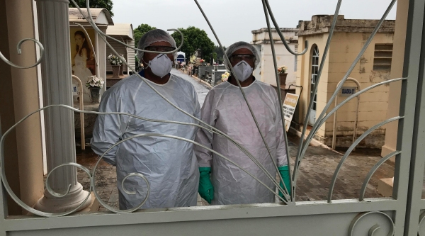 Os trabalhadores do cemitério que realizaram o sepultamento se paramentaram com capas, luvas e calçados impermeáveis, além de touca, máscaras e óculos. O funcionário do serviço funerário também trabalhou com os equipamentos de proteção individual.